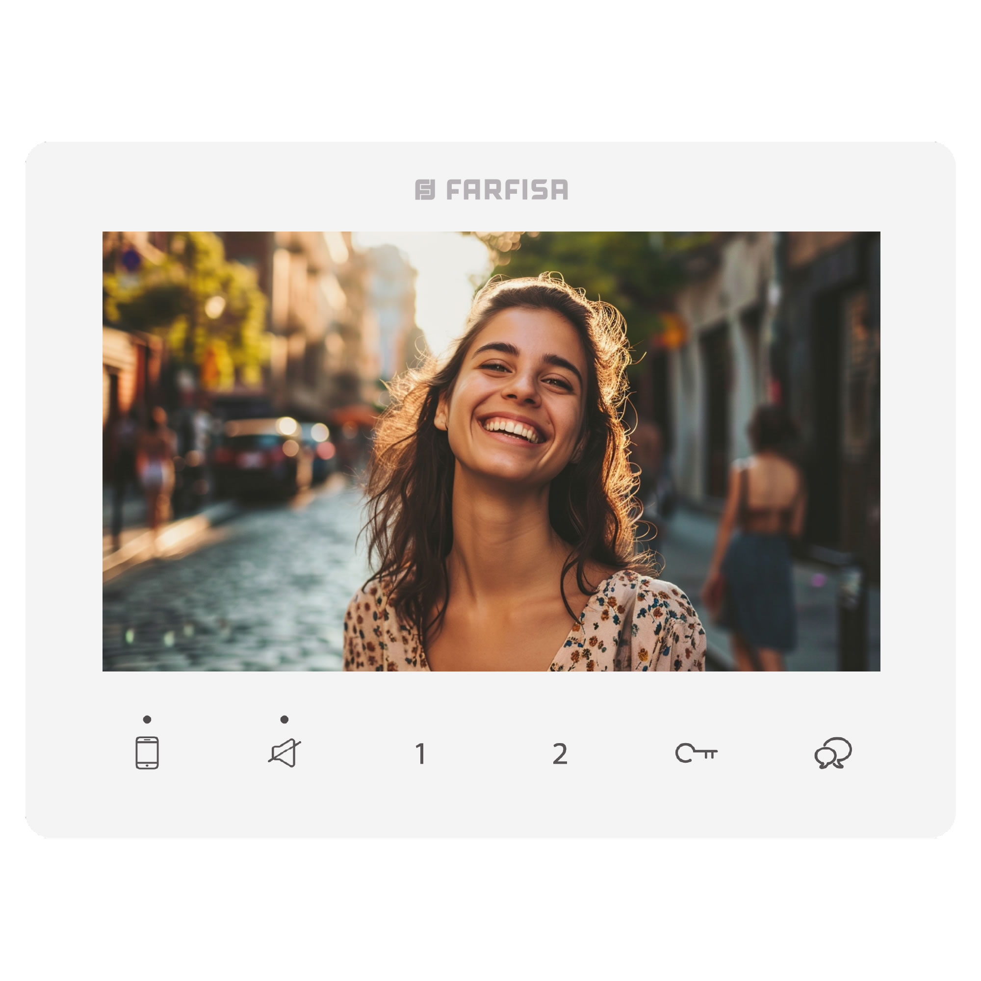 Videointercom for videokits Xentry series, valid for art. 1XN100 and art. 1XN300, Wi-Fi integrated, full duplex audio channel. Hand-free, white colour, essential design and thin. 7" screen, pure glass, touch control. 7" pure glass screen. Tuya app interface.
